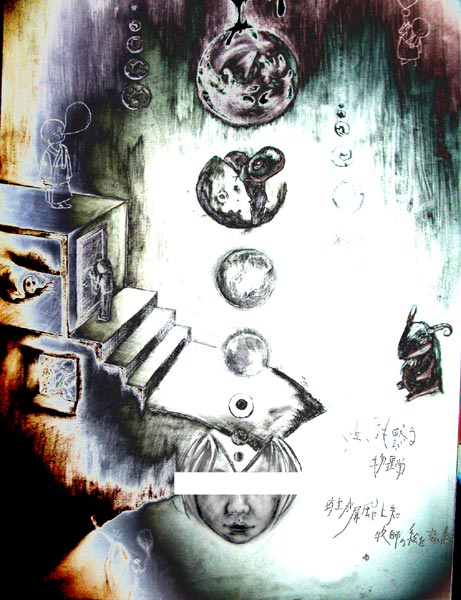 モチーフはたまの歌。 中央下の顔がボクに似てると評判だったので (別に自画像を描くつもりではなかった) モザイクを入れてみた。 なんとなく白にしたらエロ漫画の修正みたい。 でも黒だと犯罪者っぽいしなぁ。